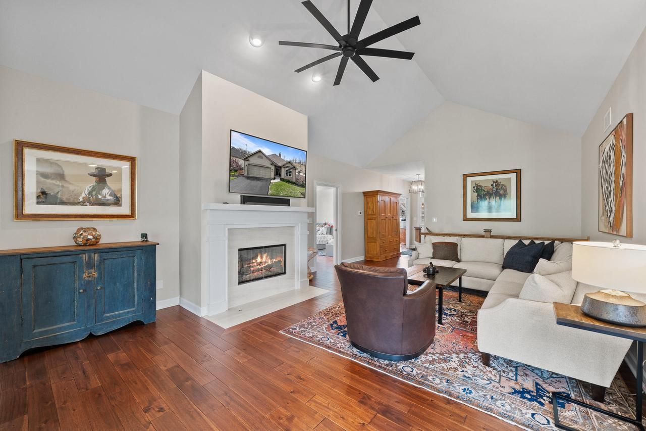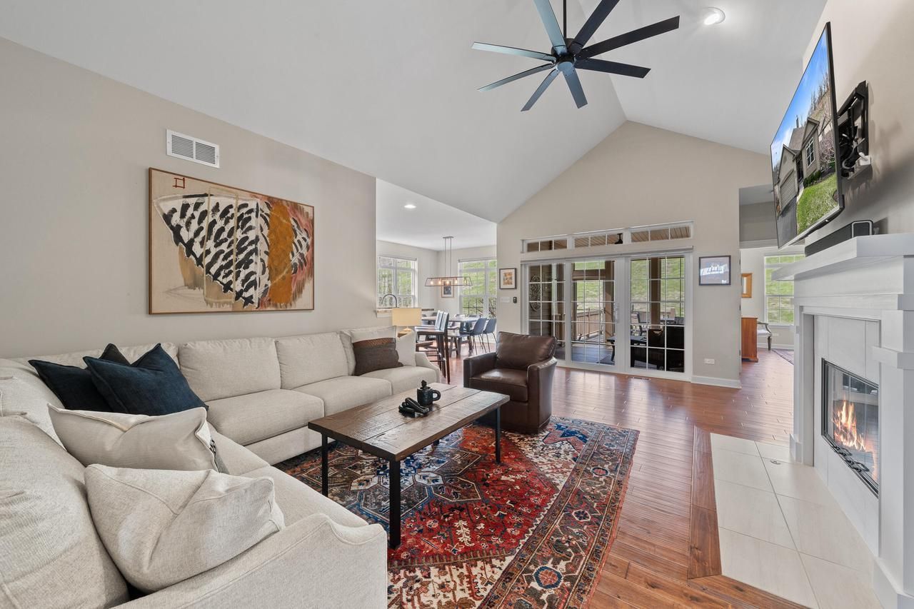 Move right in! This 3-bedroom, 3-bath like-new construction custom, low maintenance single-family home is in immaculate condition and located in The Cliffs of Fontana. Main floor master primary bedroom suite, plus additional guest bedroom and bath. The main floor den can be converted into an additional bedroom. Lower-level family room, 3rd guest room and full bath. Vaulted ceilings, acacia hardwood flooring, fireplace, upgraded kitchen cabinets with granite counters and stainless appliances. Three-season porch with custom vinal windows and deck overlooking a private hillside with views of nature. 2-car garage has coated flooring. Association common area offers a pool and playground area. Short walk to lakefront, restaurants, bars, coffee & ice cream shops, public beach & boat launc