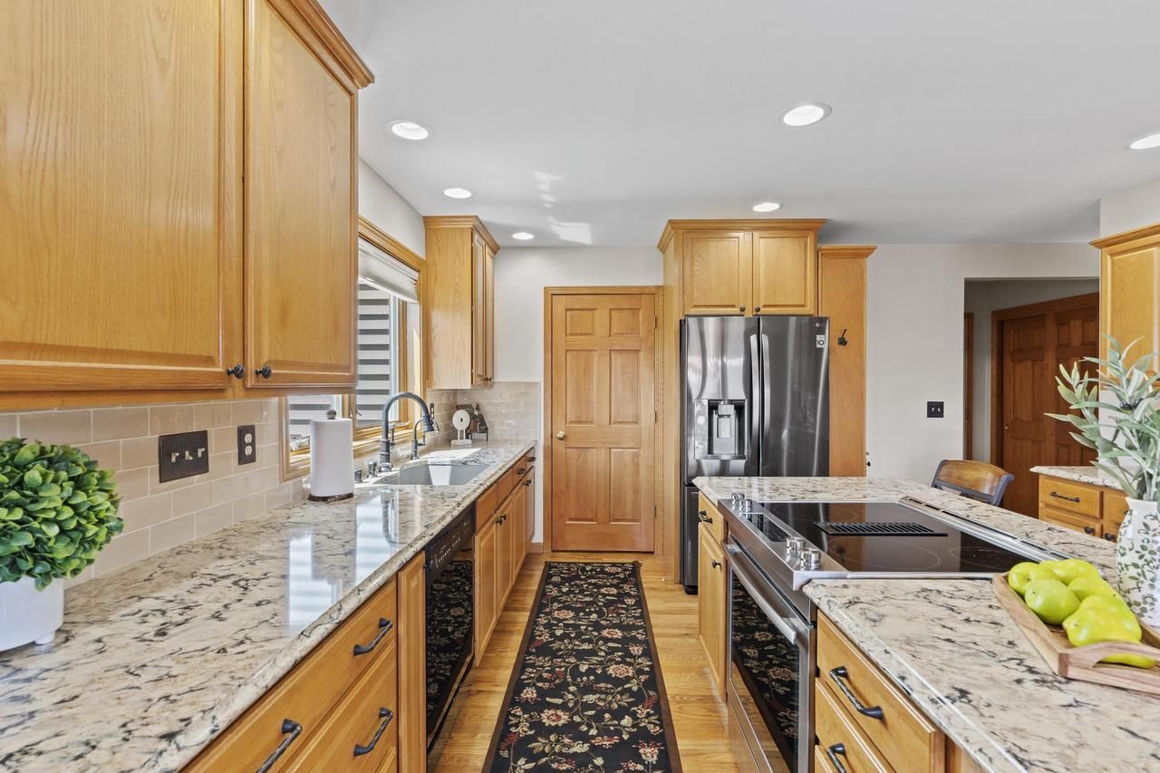 Beautifully updated ranch in Mukwonago with quality finishes and room to grow! Stunning kitchen offers huge walk-in pantry, hardwood floors, pullout drawers, soft-close cabinetry, quartz counters, oversized island with cooktop, and black stainless appliances. Large dining room with triple doors to composite deck. Vaulted great room with backyard views and stone gas fireplace. Convenient main-floor laundry off garage. Primary suite with vaulted ceiling, walk-in closet, and private bath. Two additional spacious bedrooms. Oversized 3.5-car insulated garage with new doors. Walkout lower level framed for future living space and plumbed for bath. Newer mechanicals offer peace of mind. Landscaped yard with patio and curb edging, ideal for relaxing or entertaining.
