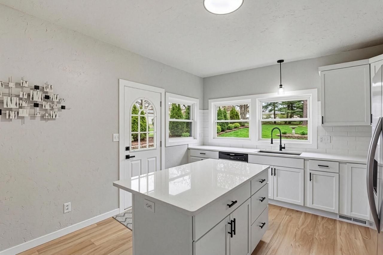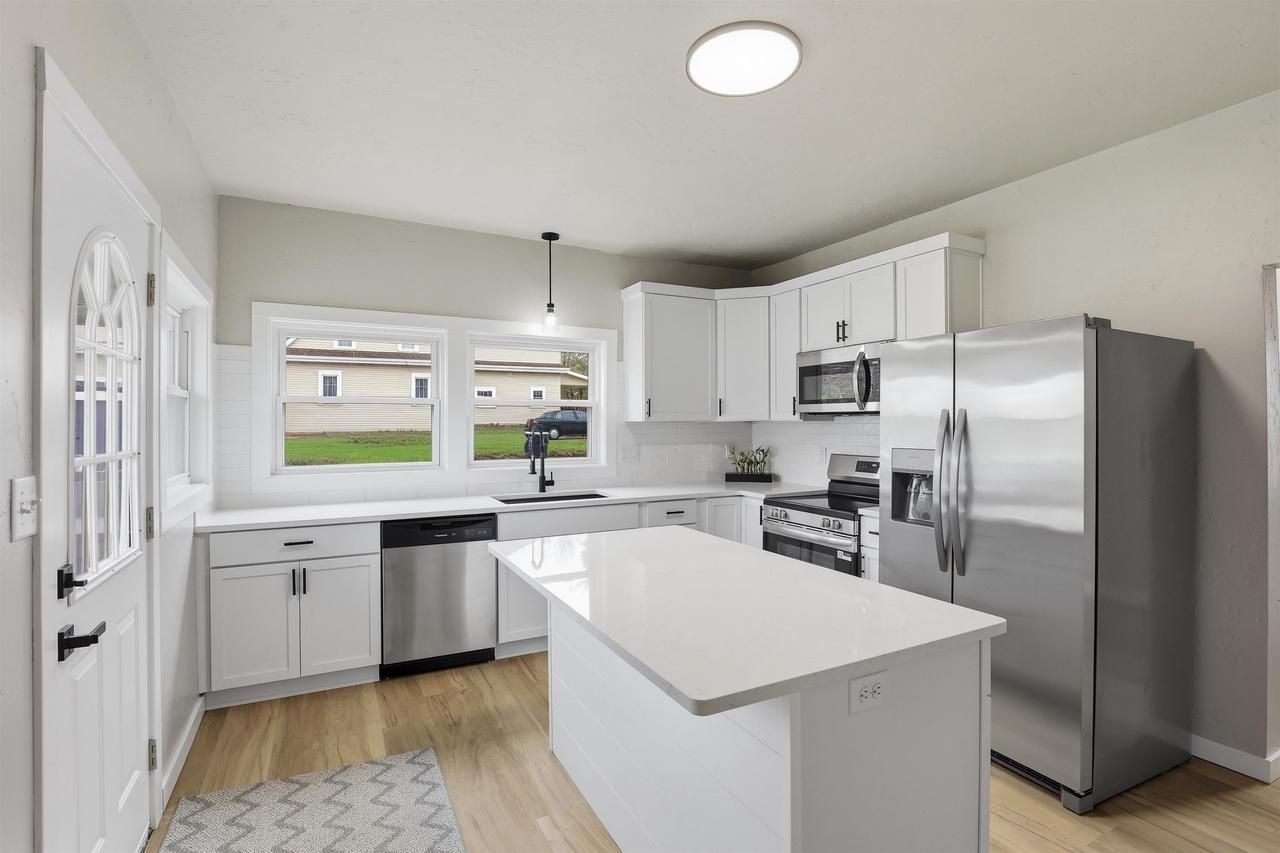 This 4 bed 2 bath on over a half acre is sure to check all of the boxes! Inside find a lg new kitchen complete w/ shaker cabinets w/ soft close doors, quartz countertops, SS appliance package and island. Formal dining room has a wall of windows. LR has tall ceilings and a ton of natural light. Main floor full bath w/ stackable first floor laundry hookups. Completing the main flr is the 4th bedroom/office area. Luxury plank throughout. Upstairs find 3 bedrooms and another full bathroom. Basement area has another laundry area. Outside find a lg concrete patio fenced backyard. Looking for ample storage? The older barn style 2.5 car garage w/ attic and LL storage has it. Extra wide/long driveway. New roof on home & garage. New siding on home. New front deck to be built prior to closing