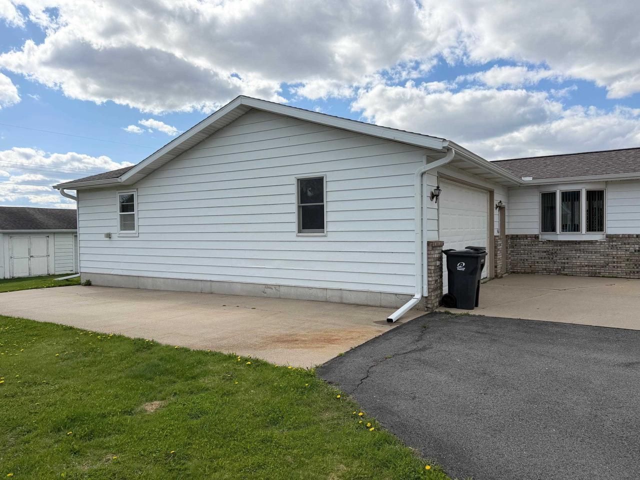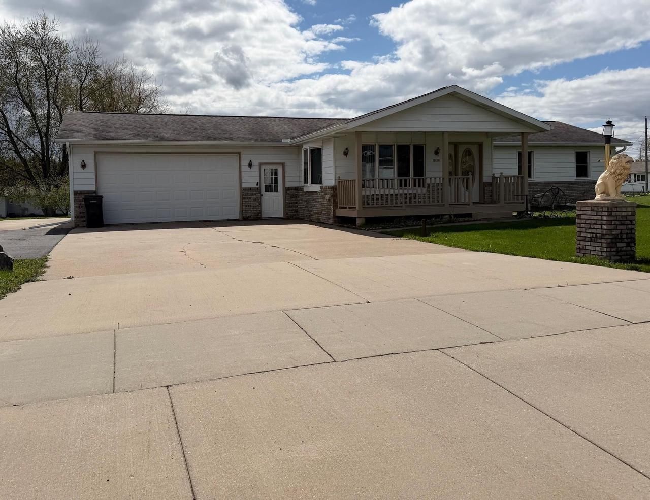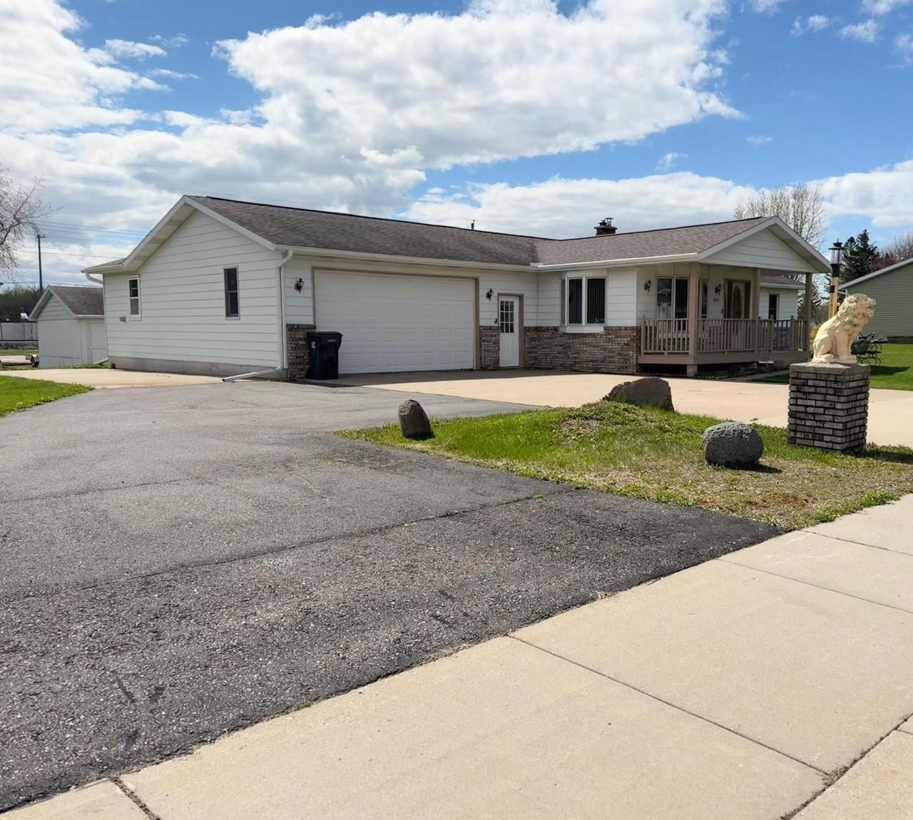 Welcome to this delightful ranch-style home, nestled on a spacious half-acre lot, ideal for those seeking the ease of main floor living. The inviting front porch is perfect for relaxing and enjoying your morning coffee while soaking in the serene surroundings. You'll appreciate the attached garage, equipped with both front and rear doors, providing ample space for a workshop or extra storage. The expansive yard features an extra utility shed, apple trees, and plenty of room for your dream garden. Additionally, there's an extra concrete pad for RV or camper parking with plug in, making it perfect for outdoor enthusiasts. Recent upgrades include newly installed gutters and skylights as of 2025, enhancing both functionality and natural light throughout the home. The welcoming entryway features a ramp for easy access, along with a convenient laundry area. The kitchen boasts oak cabinetry and plenty of counter space. A large dining room leads to a sunlit sunroom filled with windows facing west, offering stunning sunset views and warmth from an electric fireplace. Relax in the extra-
