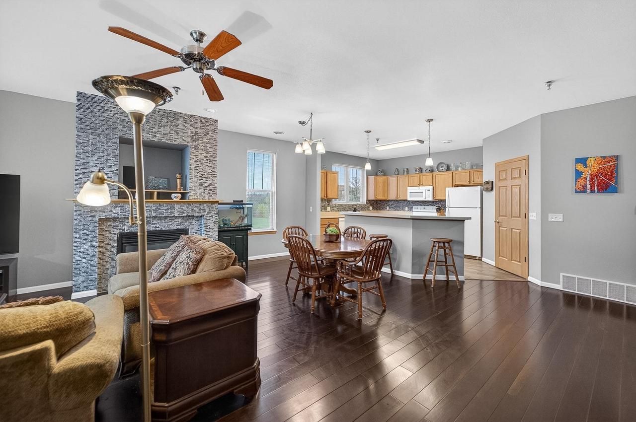Come see this gem! Meticulously maintained 2bd/2.5ba end-unit townhome filled with abundant natural light. The spacious two-level layout feels warm and inviting throughout. Main floor features high ceilings, durable simulated wood floors, tasteful paint colors, a cozy gas fireplace with custom tile surround, and windows galore. Enjoy a private entry, charming front porch, and an open-concept kitchen with a sizable island and tile backsplash. Upstairs, both generously sized bedrooms offer private ensuite baths and ample closet space. Includes 2 attached parking spaces and 2 large storage units. Conveniently located near parks, Metro Market, Great Dane, and more!