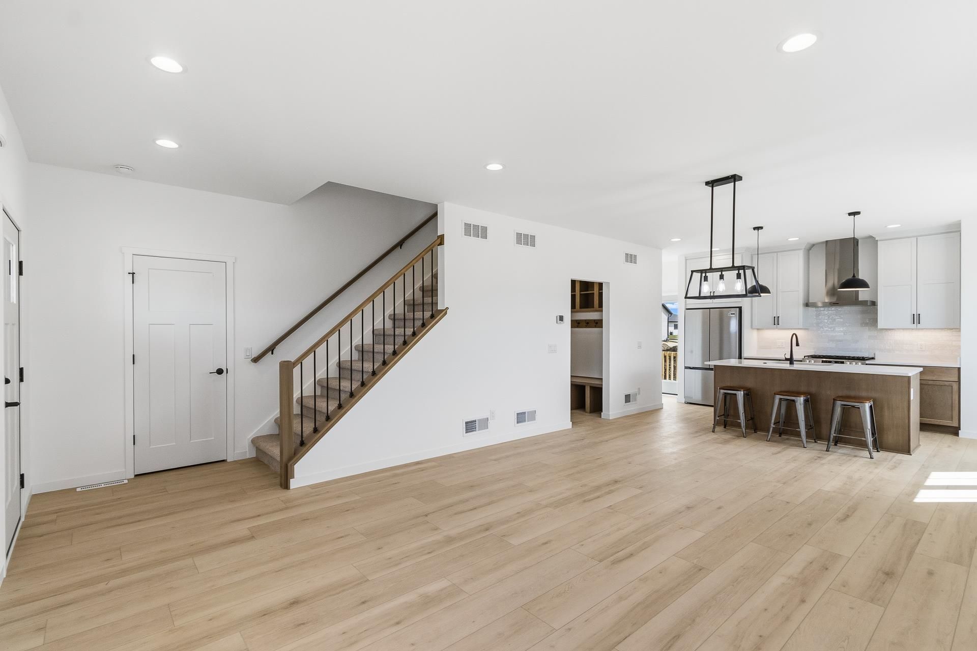 Welcome Home! Case & Son Homes presents this brand new construction - complete and move in ready - two-story home in the highly sought after Prairie View Subdivision in Arlington. Walk inside and fall in love with the spacious open concept living, dining and kitchen. The living room is highlighted by a stunning stone fireplace, creating a cozy and inviting space for gatherings. Upstairs, you will find the three bedrooms, including a serene primary suite complete with a luxurious tile shower. Enjoy the convenience of having the laundry room located on the upper level next to the bedrooms. LVP/LVT throughout the main level and laundry room with carpet on the upper level. Black windows and doors will be the perfect accent to the white vertical siding. Concrete patio included as well! Come check out all the custom features including the gorgeous railings and custom garage entry nook! This home is absolutely stunning!