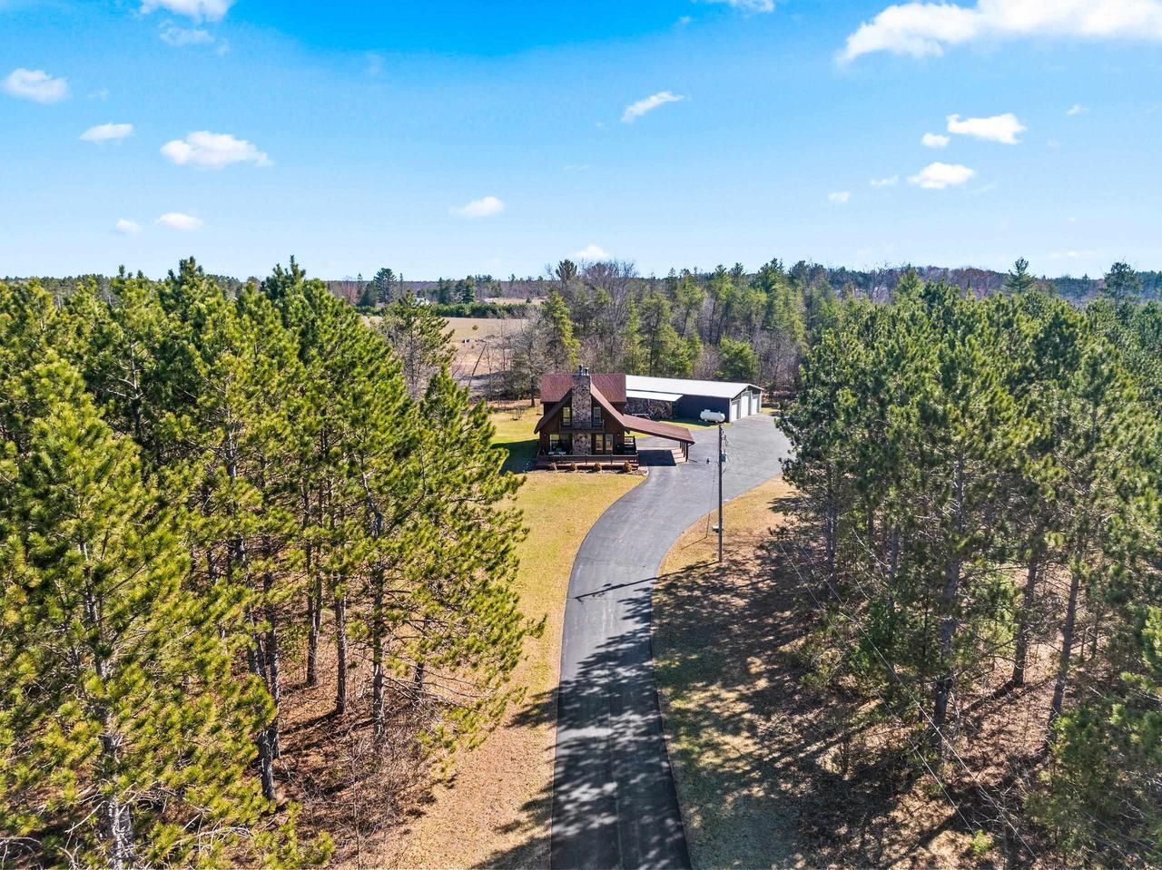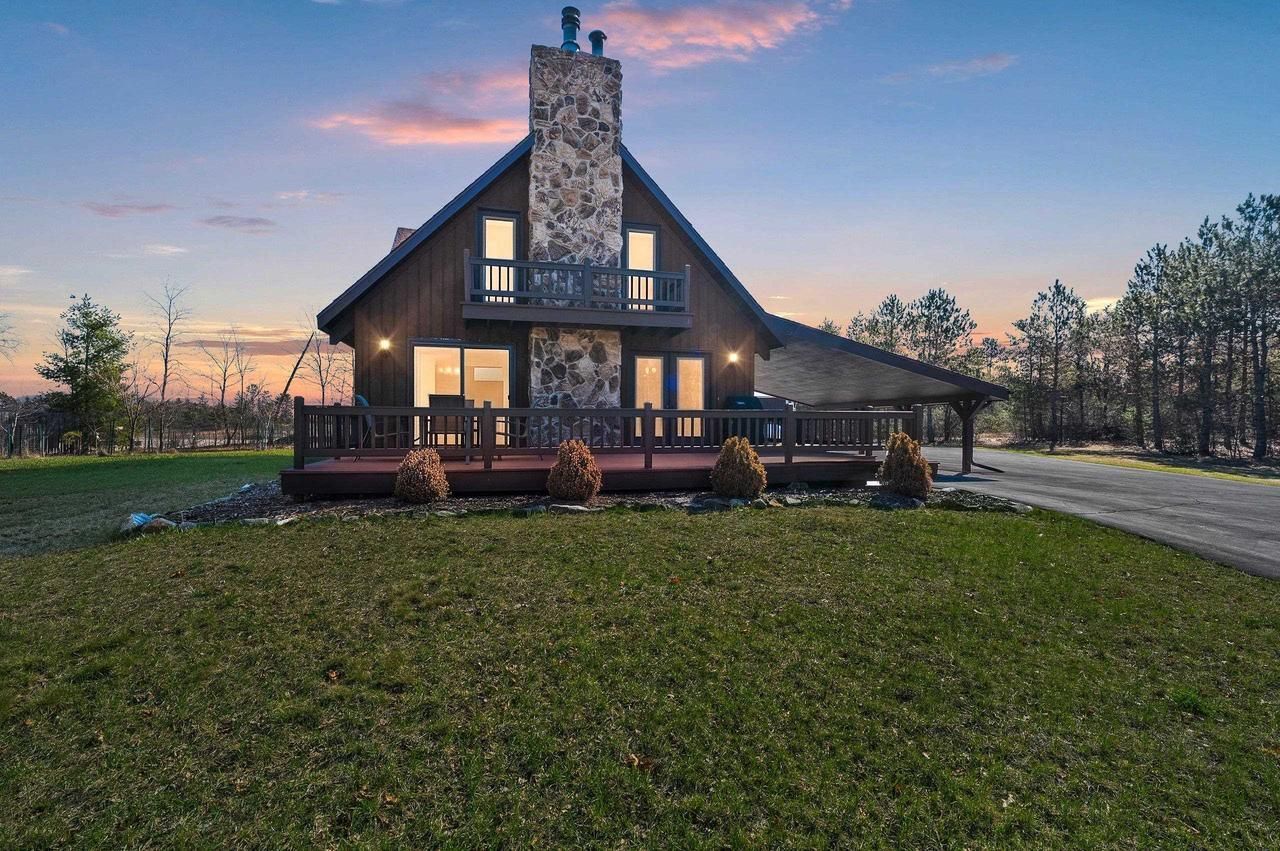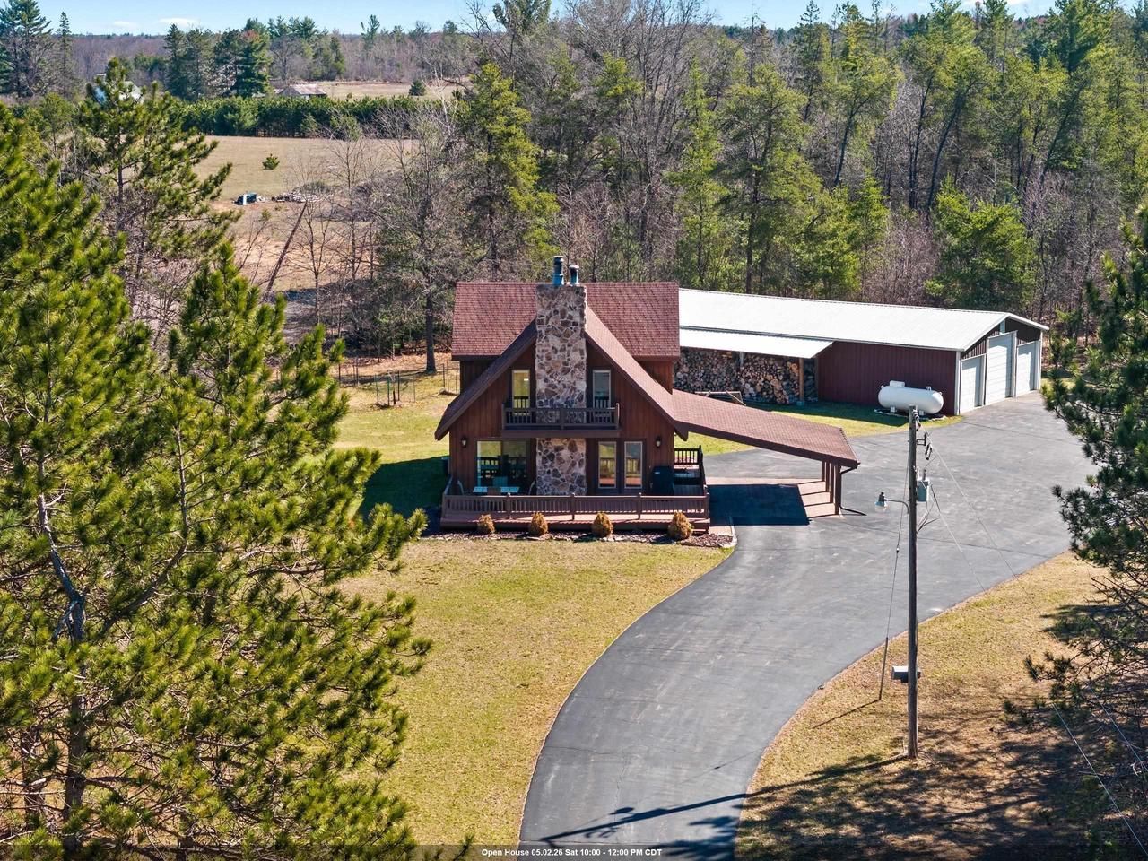 Cozy 2-bedroom, 2-bath w/rustic charm offers peace & serenity in highly desired Crivitz location! Situated on 5.92 acres, you'll enjoy a private setting while still close to town. Great room features a stunning stone fireplace, open-concept kitchen & dining area, & multiple doors leading to spacious deck. Main floor also includes a bedroom, full bath, & first-floor laundry. Upstairs, primary suite offers relaxing jetted tub, dual vanities, & abundant closet space. Also large family room w/ vaulted ceilings, fireplace, & deck access, which could easily be converted into a third bedroom. Seller updates include wood boiler, windows, patio door, well pump, propane tank, driveway, freshly stained exterior, & openers. Large Pole shed w/4 doors offers plenty of space for all your toys! Rare Find!