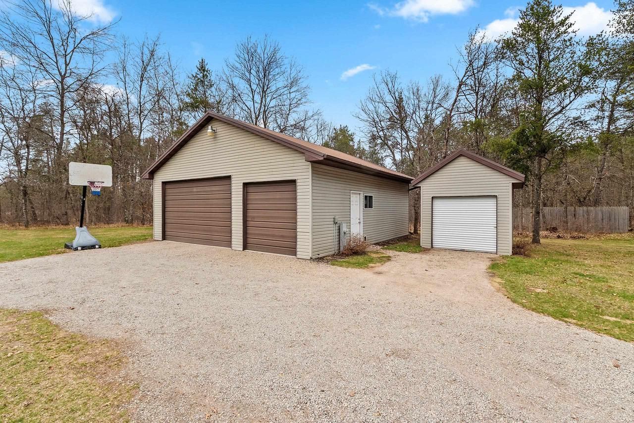 Vaulted ceilings and a wide, open living area set the tone, with natural light moving easily across the main space. The living room sits alongside a spacious kitchen with abundant cabinetry and a defined dining area that keeps everything connected without feeling crowded. Every bedroom includes a walk-in closet, while the primary suite offers dual entry to a full bath. First-floor laundry adds ease. Outside, a wraparound deck with gazebo creates an easy spot to settle in and take in the surroundings. Set on 4.79 wooded acres with frequent wildlife, no neighboring views, and direct access to public land, snowmobile and ATV trails. Large detached outbuilding fits 3+ vehicles. Quiet dead-end road near High Falls Flowage and Crooked Lake. Offers reviewed 5/4 in the evening.