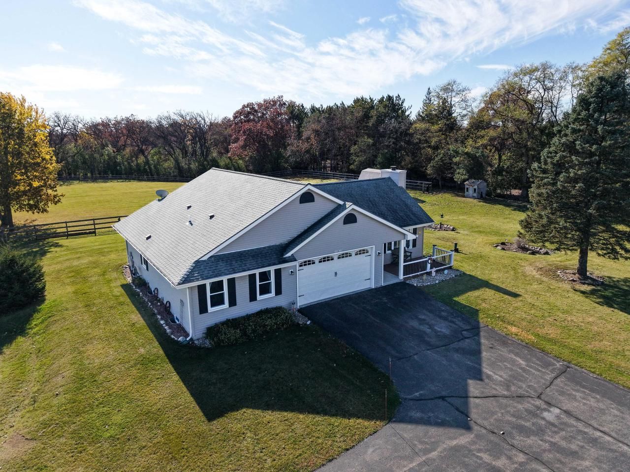 Welcome to peaceful country living. This well-maintained 3BR/2BA ranch sits on 3.1 scenic acres, offering comfort and space. The vaulted great room is filled with natural light and features a classic brick fireplace, with dual patio doors leading to a peaceful deck. The kitchen includes quartz countertops, a spacious island, and a walk-in pantry. The primary suite offers an updated en suite bath, tiled shower, and walk-in closet. Outside, enjoy a cedar-fenced area and a barn with a horse stall, water, and electricity, plus room to expand. The lower level has plumbing for a future bath. 2.5-car garage. Snowmobile trails next door, small lakes to swim, and a nearby dog park with outdoor recreation just minutes away.