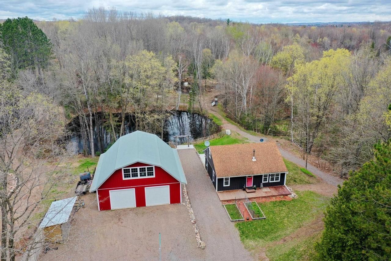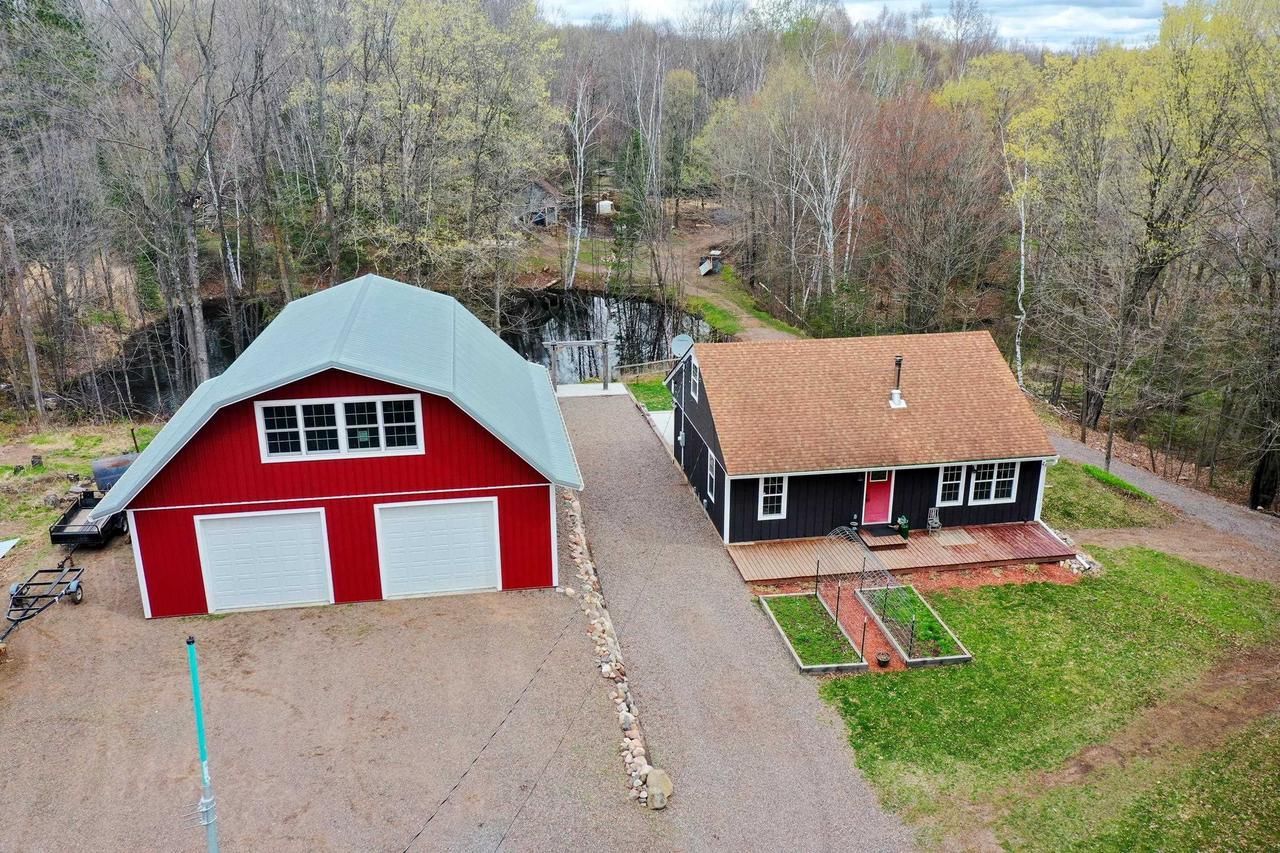 Charming 4 bedroom, 1.5 bathroom home on +/-3.81 wooded acres. Kitchen with oak cabinets and pantry. Living room with wood stove. 2 main level bedrooms. Walk-out basement with storage rooms. Rear covered patio with firepit overlooking pond and spillway. 36x36 metal shed built in 2022 with 10 foot doors, plumbed for bathroom and 36x18 upper level that is insulated and ready to be finished into additional living space. 20x14 barn for hobby farming. Great contour with a nice mix of hard and soft woods. Located on a blacktop road and close to Chelsea Lake, Shearer Lake and the Chequamegon National Forest. Refrigerator, stove, microwave, washer, dryer, wood shed, dog kennel in garage, wood stove in living room and central vac are included in the sales price.