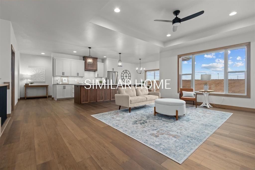 Situated on .84 acres in the Kimberly School District, this beautifully designed home blends comfort and craftsmanship. The kitchen features a 10? island, quartz countertops, tile backsplash, walk-in pantry, and custom locally made cabinetry. The open living room offers a step tray ceiling, built-ins, and a gas fireplace. The primary suite includes a walk-in closet, dual sinks, tile shower, and soaking tub. A finished 3-car garage with plastered walls, floor drains, and basement access adds convenience. The basement includes an egress window and is stubbed for a future bath. With 9? ceilings, main floor laundry, and a covered patio and porch, this home stands out in this subdivision at under $300 per square foot
