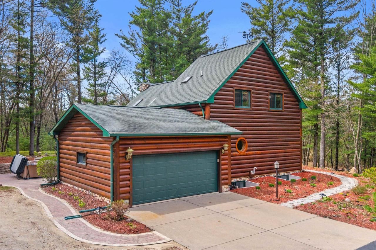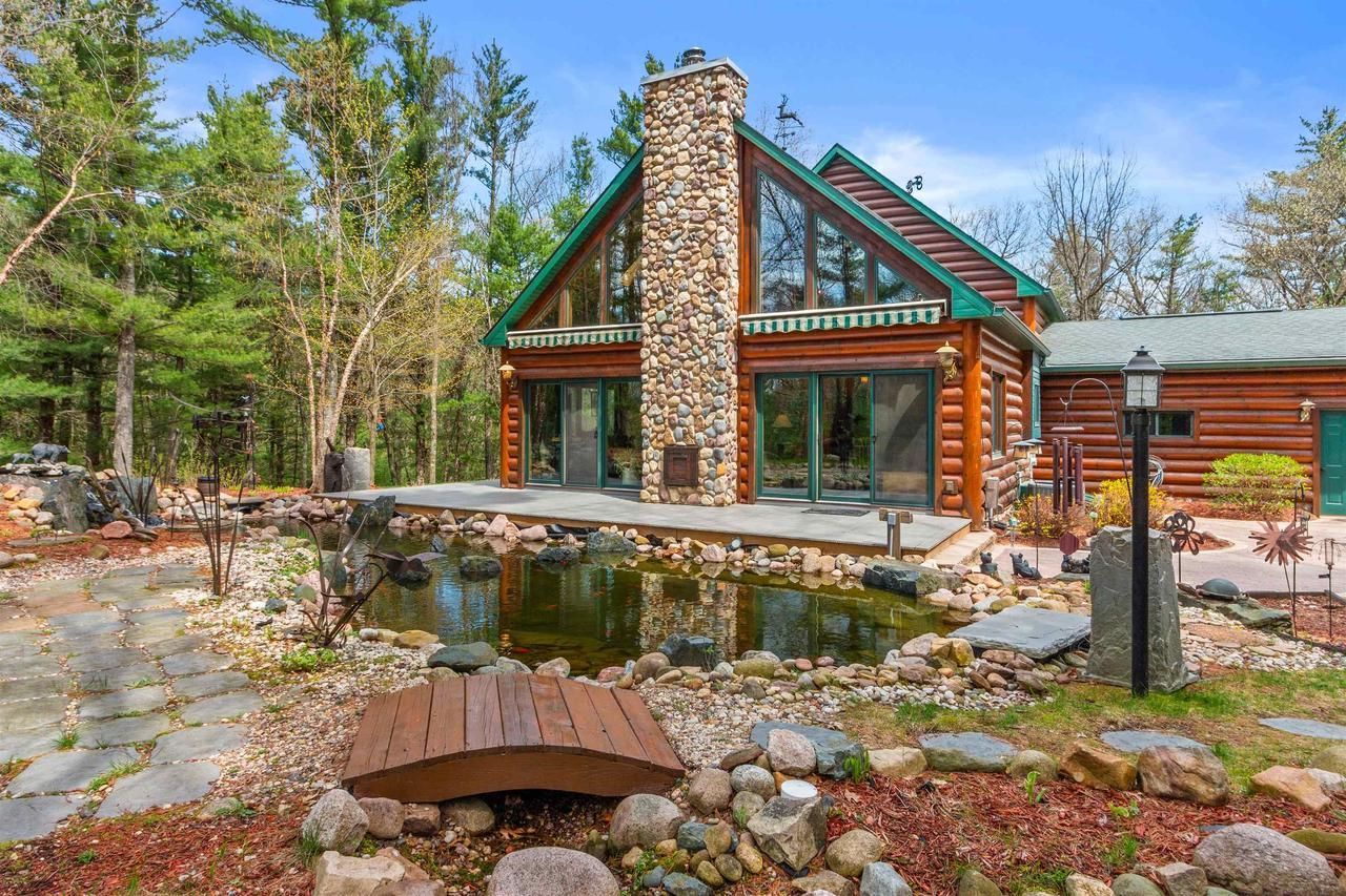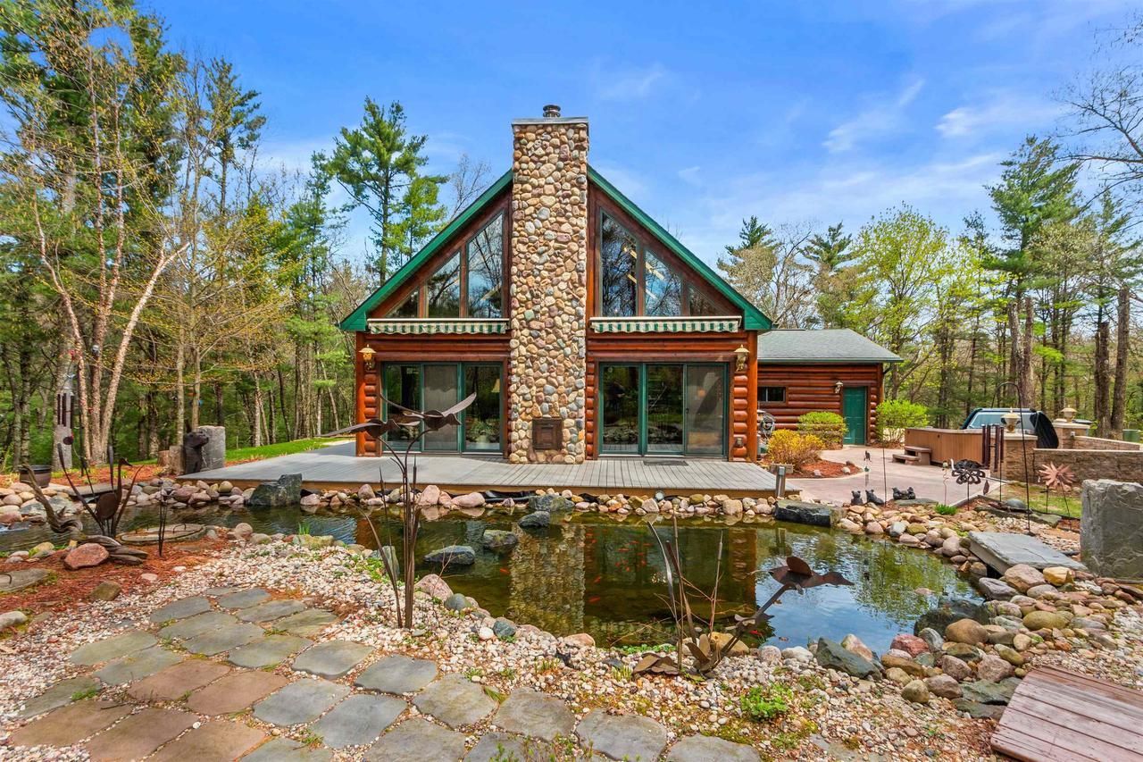 Fall in love with this custom-built, log-faced lodge-style home set on 5.14 private acres. This well-maintained 3-bedroom, 3.5-bath property features numerous updates throughout. A soaring cathedral ceiling highlights the stunning stonework surrounding a warm soapstone fireplace, while floor-to-ceiling windows fill the home with natural light. The finished lower level includes a full bath and durable painted concrete floors, offering flexible space for a recreation room, family area, or additional bedroom. Relax on the deck overlooking a beautifully landscaped, stocked pond, where wildlife roam about adding to the peaceful, secluded setting. This home has so much to offer, numerous updates (see list) and move in ready. Prepare to fall in love.